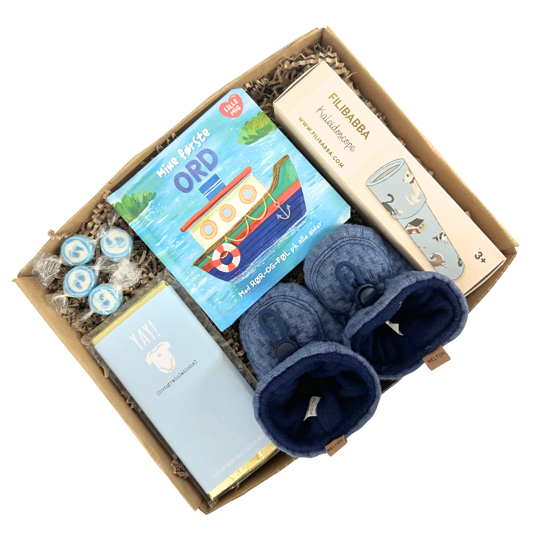 Produkt id: barselsgave-blå-gave-med-mine-første-ord