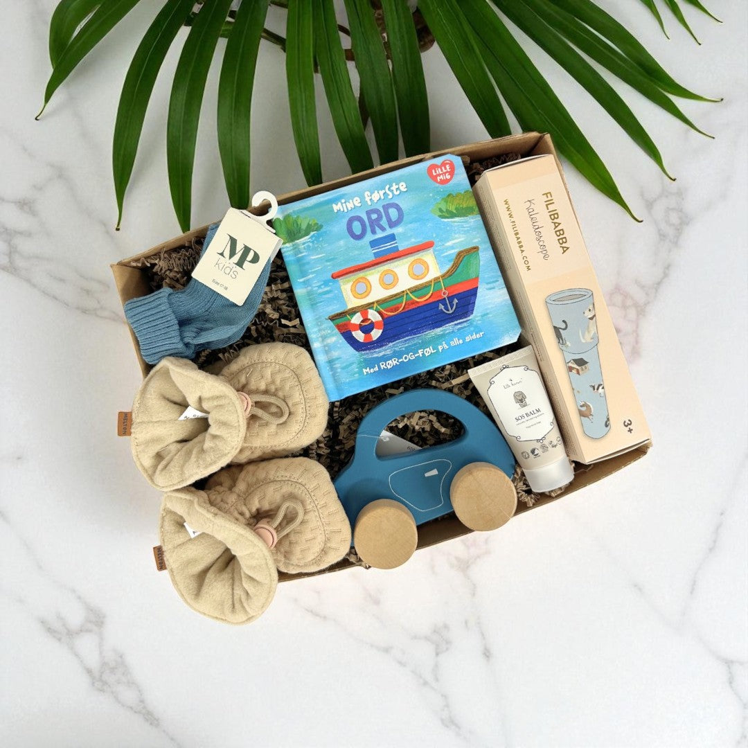 Produkt id: barselsgave-med-bog-legetøj