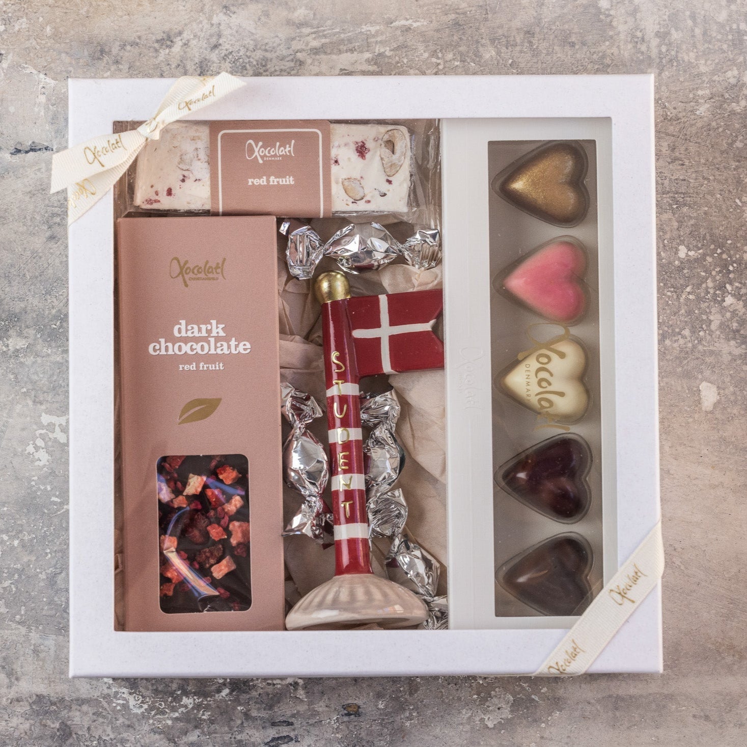 Vi har fundet Gaveæske Lækker Gaveæske Til Studenten fra Xocolatl hos gaestus i kategorien . Studentertiden er en festlig tid, hvor man ofte bliver inviteret til studentergilder og sammenkomster. Denne tid indebærer også ofte små værtindegaver, og derfor er denne studenter-gaveæske en fin gaveid. Æsken indeholder lækkerier og et fint keramikflag