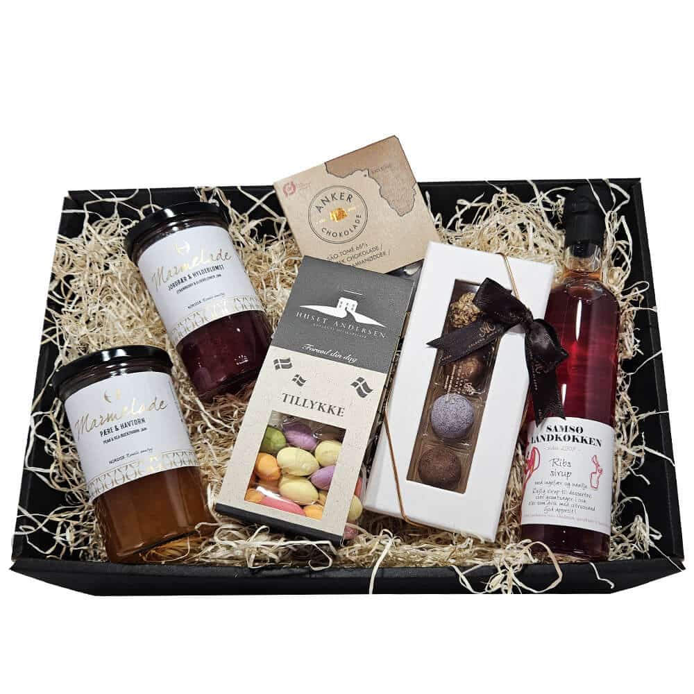 Vi har fundet Gavekurv: Luksus Tillykke Med Marmelade Chokolade hos smagfuld danmark i kategorien . Luksus Tillykke med Marmelade Chokolade – et perfekt TillykkeEt tillykke bør ikke bare høres det bør mærkes og smages. Med gavekurven Luksus Tillykke med Marmelade Chokolade får du en uforglemmelig hilsen fyldt med danskproducerede delikatesser, nø