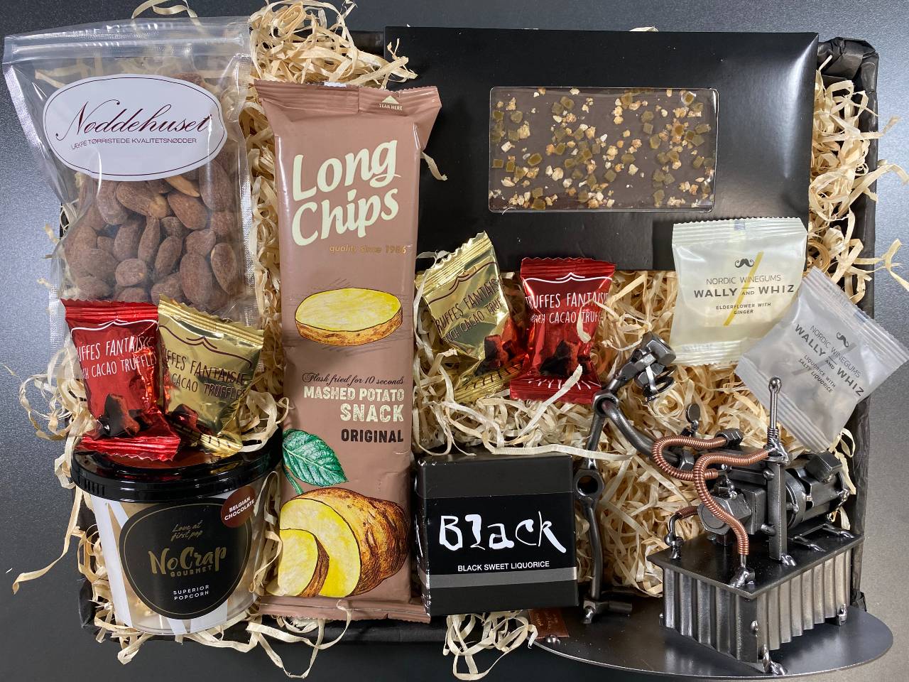 Produkt id: gavekurv-med-metalfigur-maskinmester-entreprenørmaskinmekaniker-lækkerier