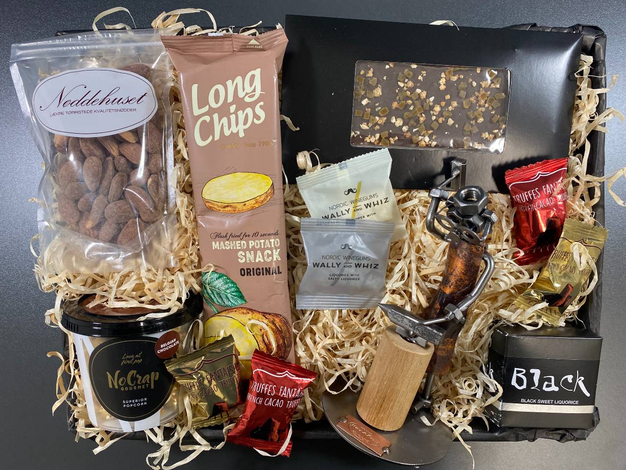Produkt id: gavekurv-med-metalfigur-smed-ved-ambolt-lækkerier