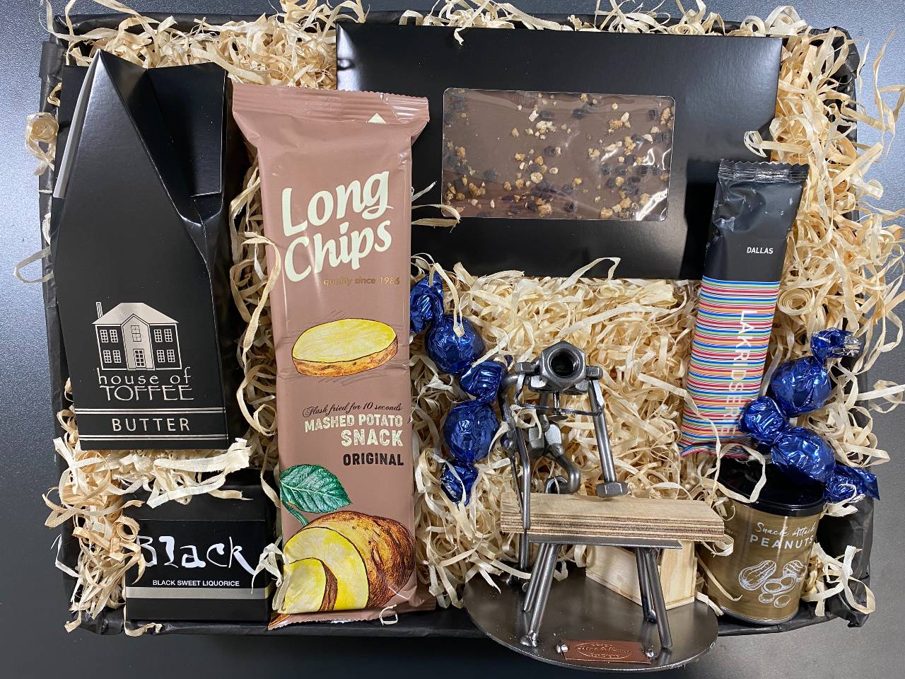 Produkt id: gavekurv-med-metalfigur-tømrer-tømrersvend-lækkerier