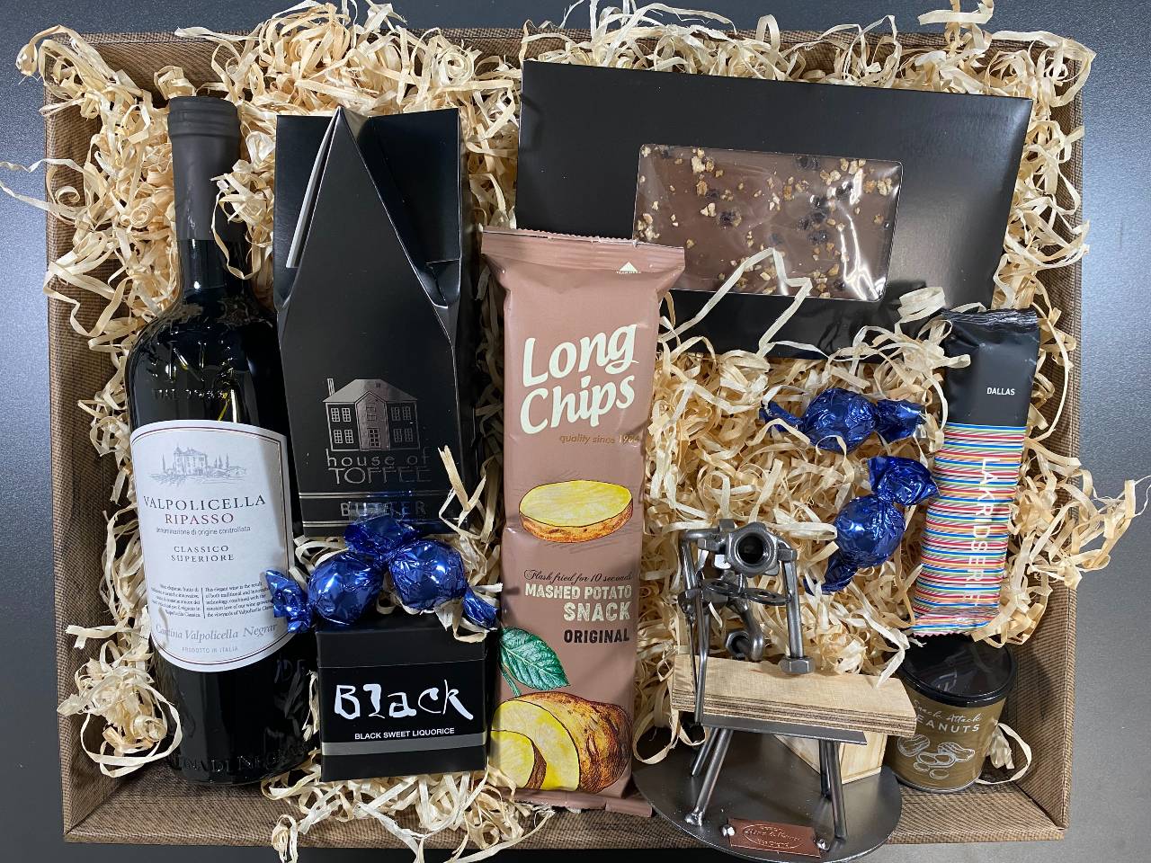 Produkt id: gavekurv-med-metalfigur-tømrer-tømrersvend-vin-hygge
